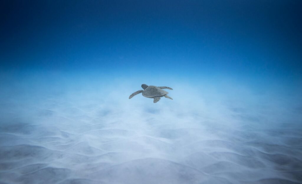 Una tortuga marina verde (también llamada Chelonia mydas) emerge del fondo arenoso. Es más grande de lo que esperabas - hasta 1.5 metros de largo. Se mueve lentamente, masticando pastos marinos. El momento es surrealista.